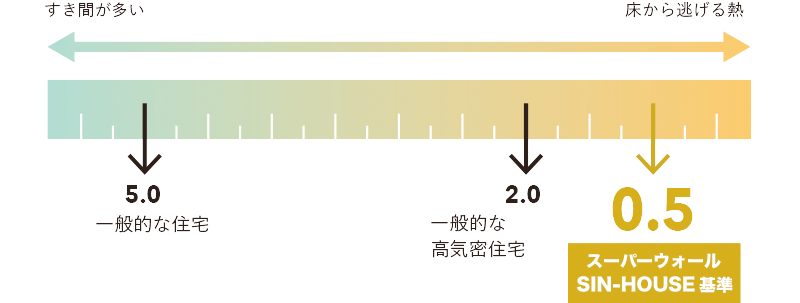 スーパーウォールは壁・床・天井が一体化した箱形を構成するモノコック構造のため、すき間が非常に少ないのが特徴です。SIN-HOUSEで施工したスーパーウォール住宅の、外部期間の検査による平均C値は現在「0.35」となっています。