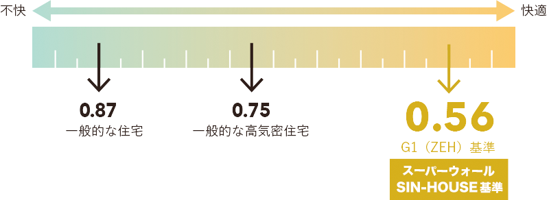 UA値(外皮平均熱貫流率)は断熱性能を表した数値で、外皮を介して住宅全体の熱がどれくらい逃げやすいかを示しています。数値が低いほど断熱性能にすぐれた住宅となります。スーパーウォールは一般的な断熱材よりも性能に優れ、SIN-HOUSEでは外部期間による検査でUA値の平均値0.56という値を出しています。(一般的な「高気密住宅」では平均値0.75)