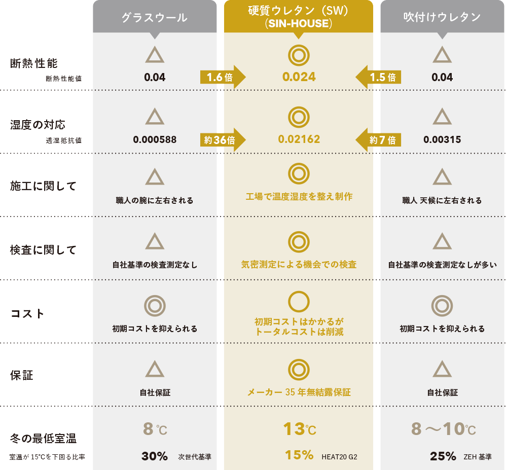 それでは一般的な住宅で使われている断熱材とスーパーウォール(硬質ウレタンパネル)の比較です。