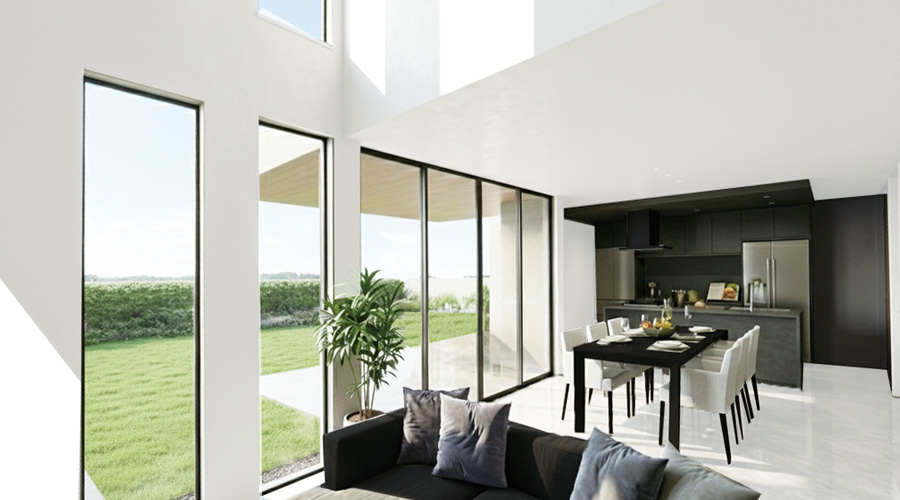南側の大開口から光が差し込み、吹き抜けを通して空間全体へ広がる設計。実際に立ってこそ分かる、明るさと広がりがあります。