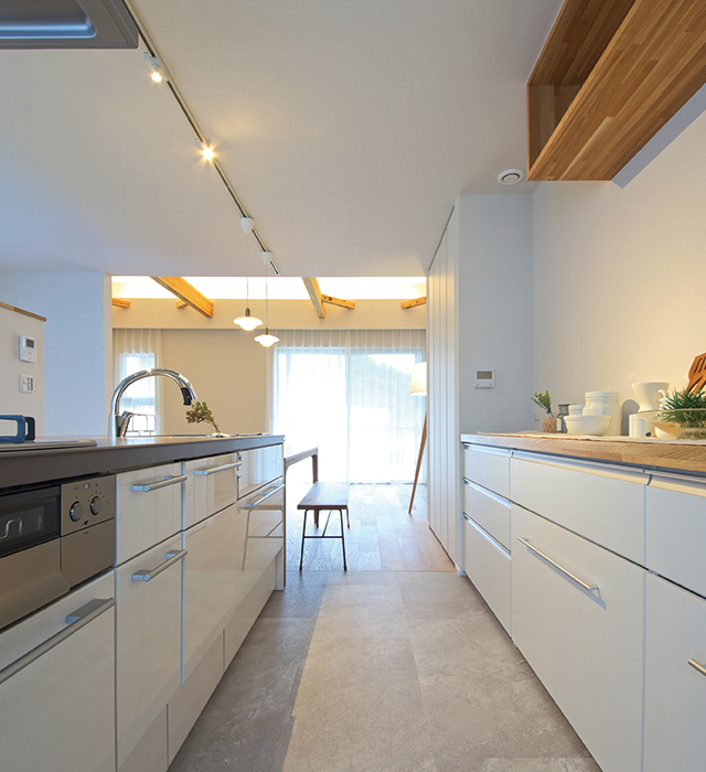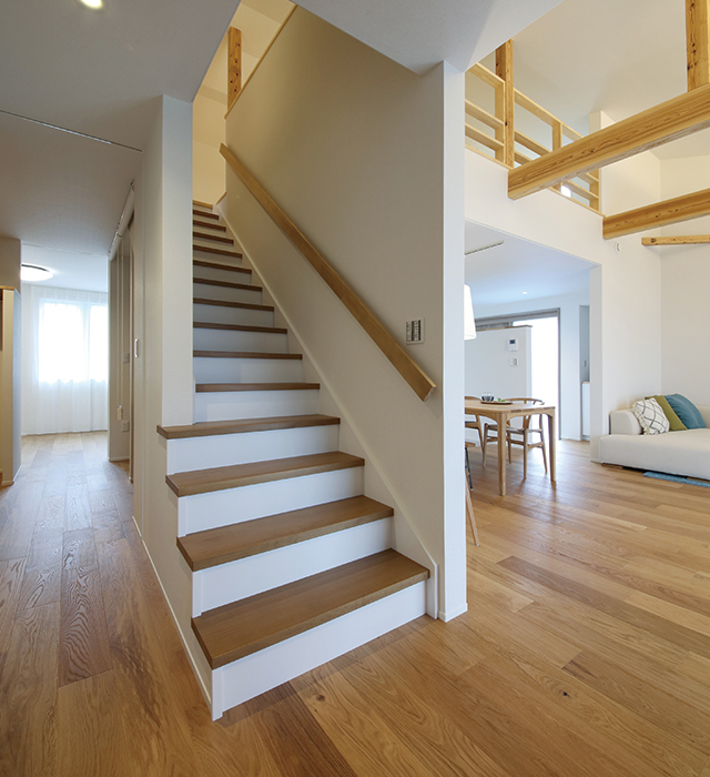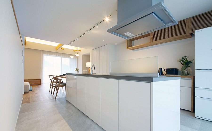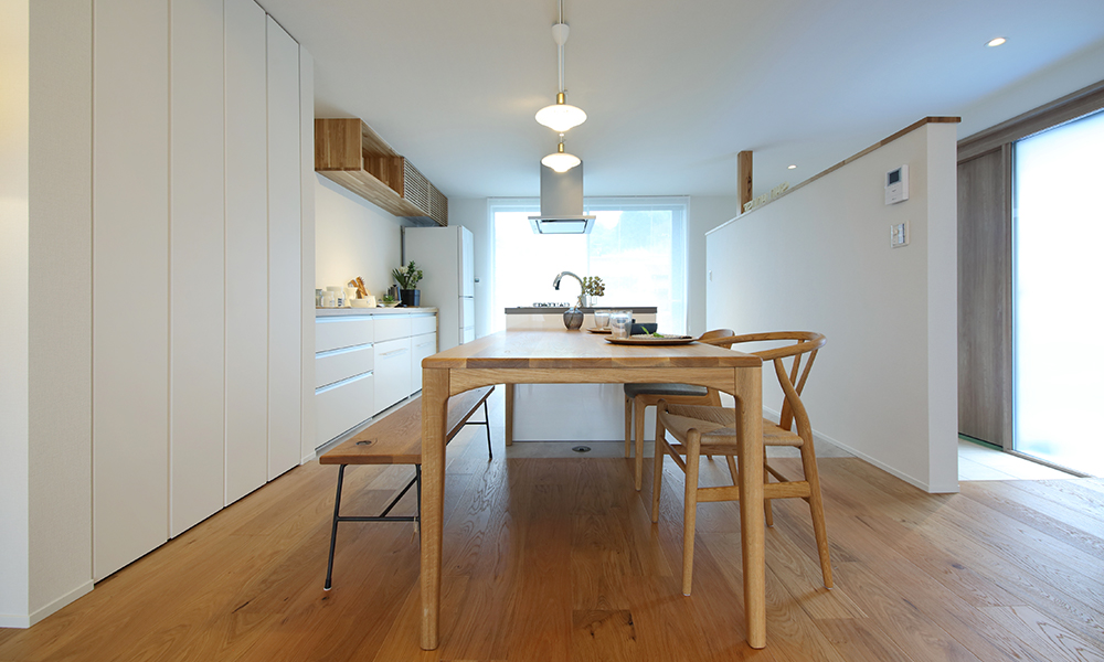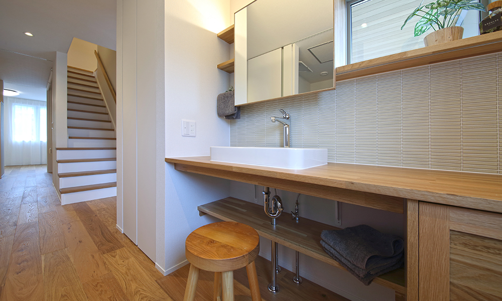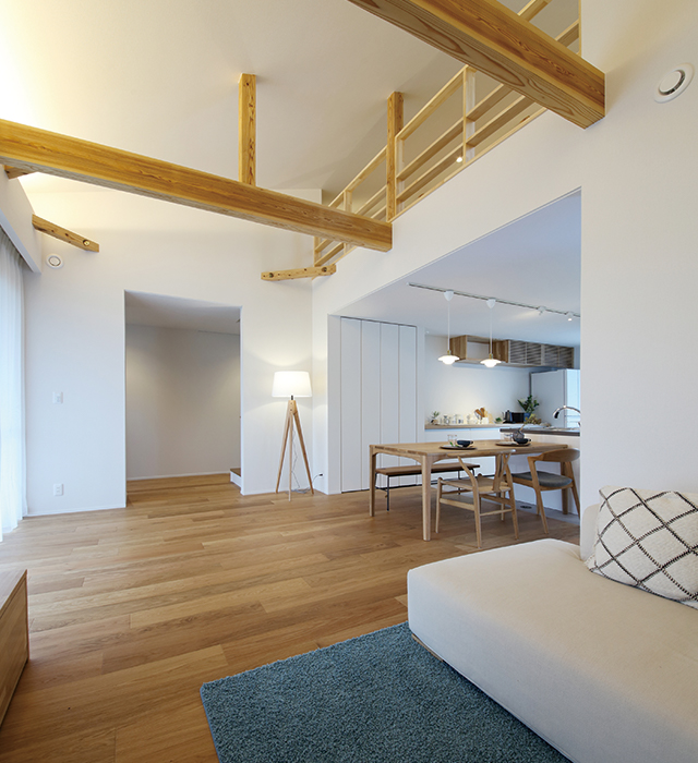 高気密高断熱のスーパーウォール工法だからこそできる、開放感ある空間も見どころです。建築に携わっているご夫婦が、一緒に考えぬいたこのお家は、家事のしやすさに加え、無理する事なく生活感を出さない工夫も満載です。