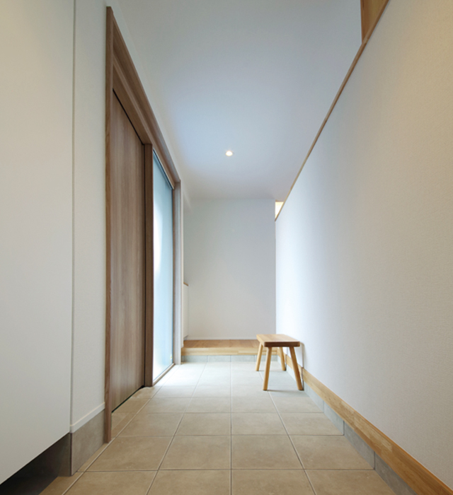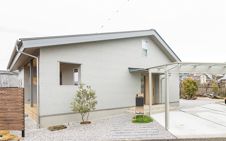 平屋風のシンプルな外観で、まわりの建物に自然と溶け込む様な佇まい。のどかな田園風景や、お庭との「つながり」をもたらす「抜け感」のある間取り、そして家族との「つながり」も大事にしたシンプルな設計になっています。