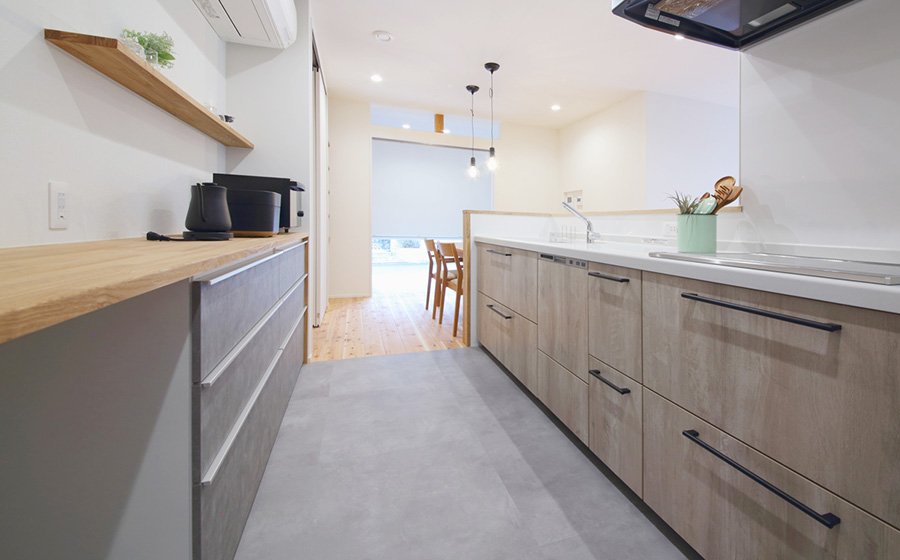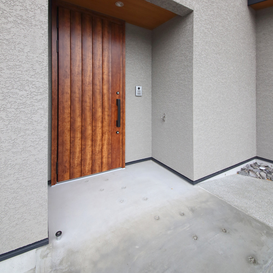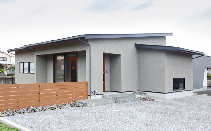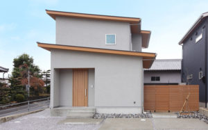 グレーの塗壁と木目の組み合わせが素敵な外観